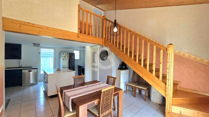 La maison dispose d'une pièce de vie de 52 m², où vous trouverez une cuisine ouverte récente, entièrement aménagée et équipée, sans oublier les deux terrasses. La maison comprend trois chambres dont 2 avec placard, 1 salle d'eau et deux WC.