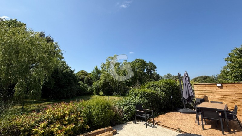 Profitez d'une grande terrasse donnant sur un jardin arboré, un véritable havre de paix pour vos moments de détente.
