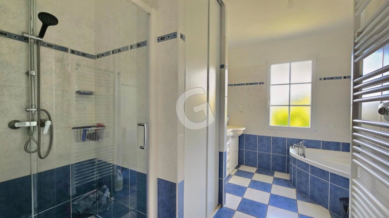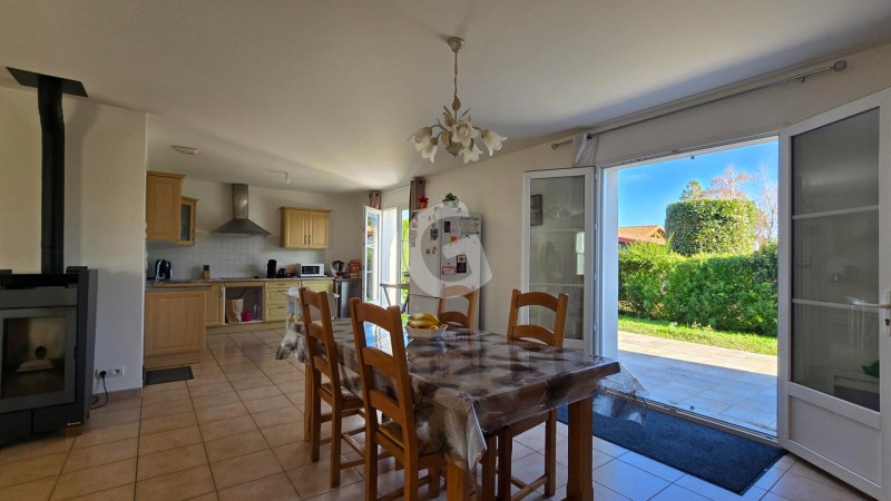 Maison de 108 m² construite en 2007, comprenant une pièce de vie de 55m² équipée d'un poêle à granulés et d'une cuisine ouverte aménagée. Un couloir mène à trois chambres, dont deux avec placard intégré, ainsi qu'à une salle de bain comprenant une douche et un placard et un wc séparé.