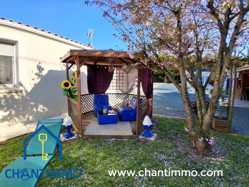 Prélassez vous dans le jardin clos et sans vis à vis de 1645m² joliment aménagé avec goût comprenant une terrasse avec préau, une piscine hors sol en bois avec espace détente et cuisine d'été à proximité, un bassin à poissons et une volière.