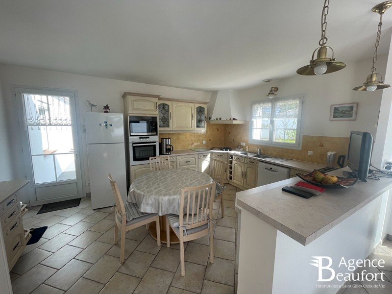 A seulement 1400 m des commerces et 5 kms de la gare de St Gilles Croix de Vie, maison en parfait état de plus de 130 m² habitables comprenant une belle pièce de vie avec cuisine aménagée et équipée, 3 chambres, bureau, salle d'eau avec wc, cellier, wc séparée et garage double, le tout sur plus de 1000 m² de terrain clos, ensoleillée et piscinable. A découvrir...