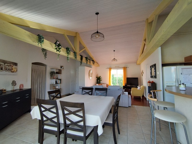Dans un quartier agréable proche d'un supermarché et à 1.6 km de la plage de Tanchet, maison de plain-pied offrant une entrée avec placard, une belle pièce de vie cathédrale avec une cuisine ouverte équipée, 3 chambres dont une avec dressing, un bureau, une salle de bains avec douche et baignoire, 2 wc séparés, une buanderie et un garage. Une pièce d'été donnant sur la piscine a été aménagée, et bénéficie d'une salle d'eau wc. Piscine chauffée. Jardin clos sans vis à vis.