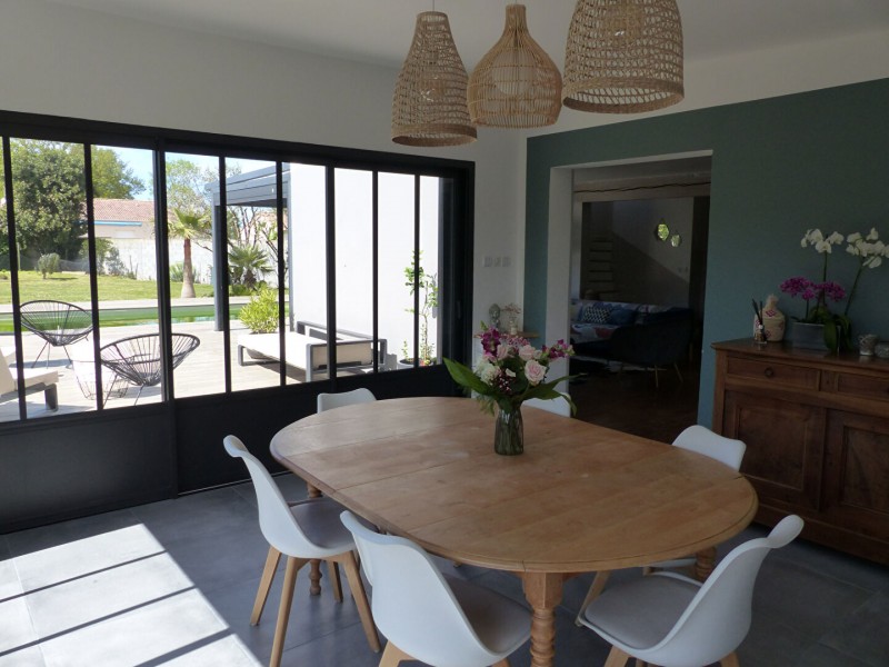 Agence DES PRESIDENTS vous propose : EXCLUSIVITE ! A deux pas des commerces de proximité (boulangerie, supérette, bureau de tabac), belle maison rénovée de 148 m² habitables à la décoration soignée. Elle dispose d'une pièce de vie avec une cuisine ouverte aménagée et équipée, d'une salle à manger (agrandissement 2023), wc séparés, et à l'étage 4 grandes chambres avec placards, un dressing, une spacieuse salle de bains avec baignoire, douche et double vasque, wc séparés. Une buanderie/chaufferie de 35 m² avec beaucoup de rangements vient compléter la surface (possibilité de remettre en garage. Vous bénéficierez également d'un beau terrain arboré de 1057 m² avec piscine (2020) et terrasses, et d'un atelier.